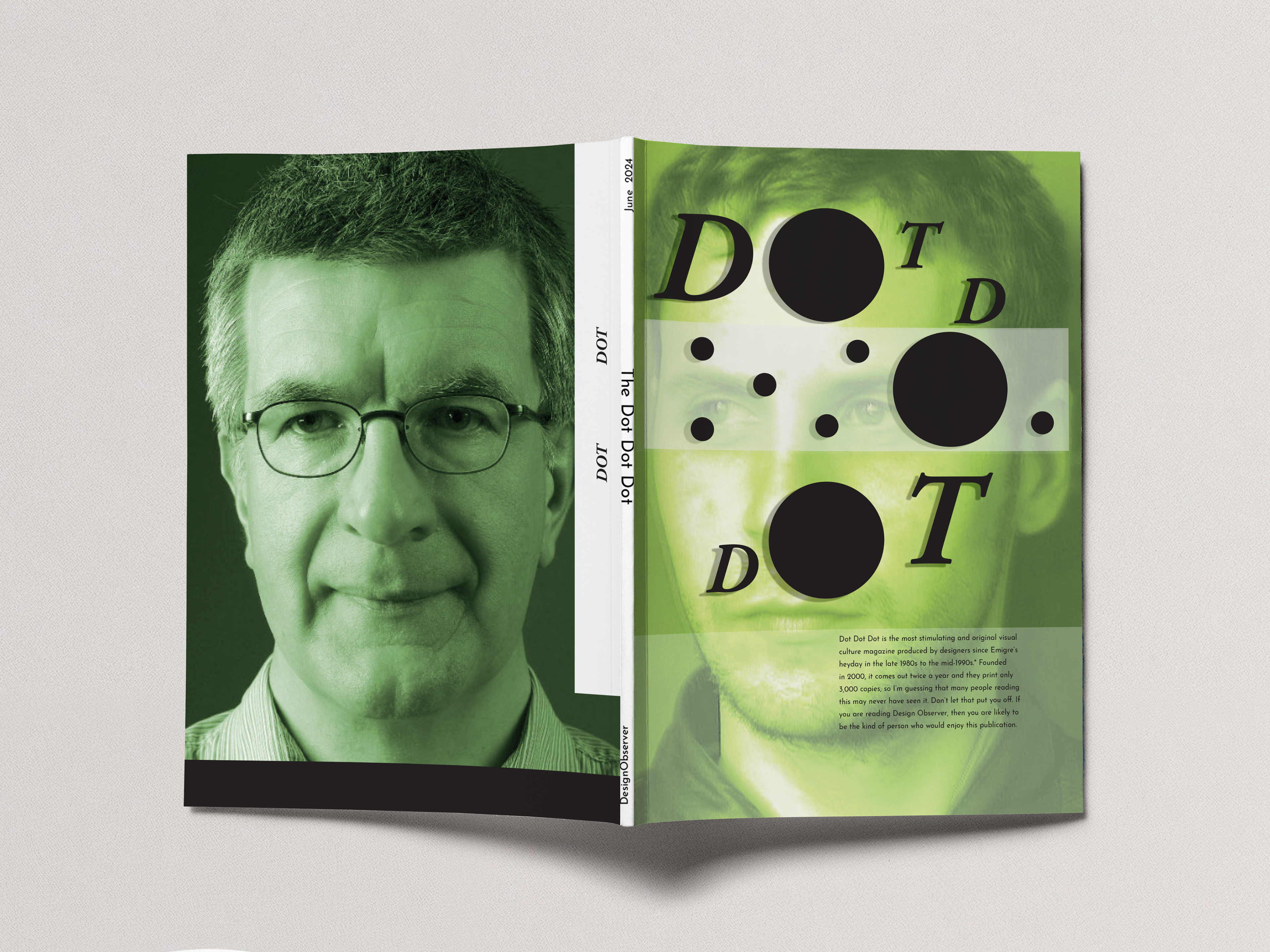 IMAGERY The magazine skillfully integrates portrait photography and abstract graphics, creating a dialogue between text and image. The green-tinted portraits evoke a sense of modernity and freshness, while the placement of abstract dots and shapes adds a playful, yet sophisticated touch, emphasizing the magazine’s focus on design and culture.