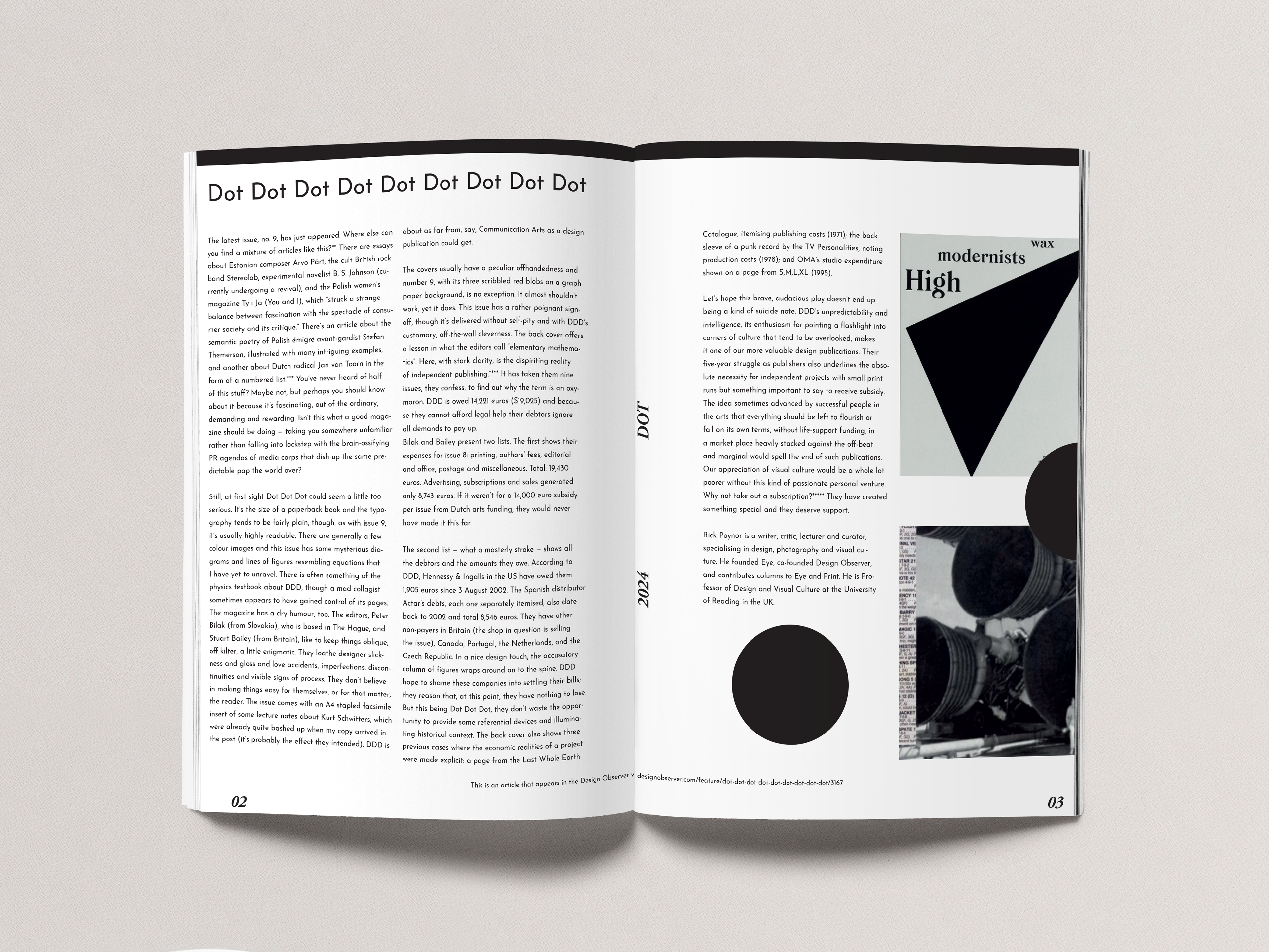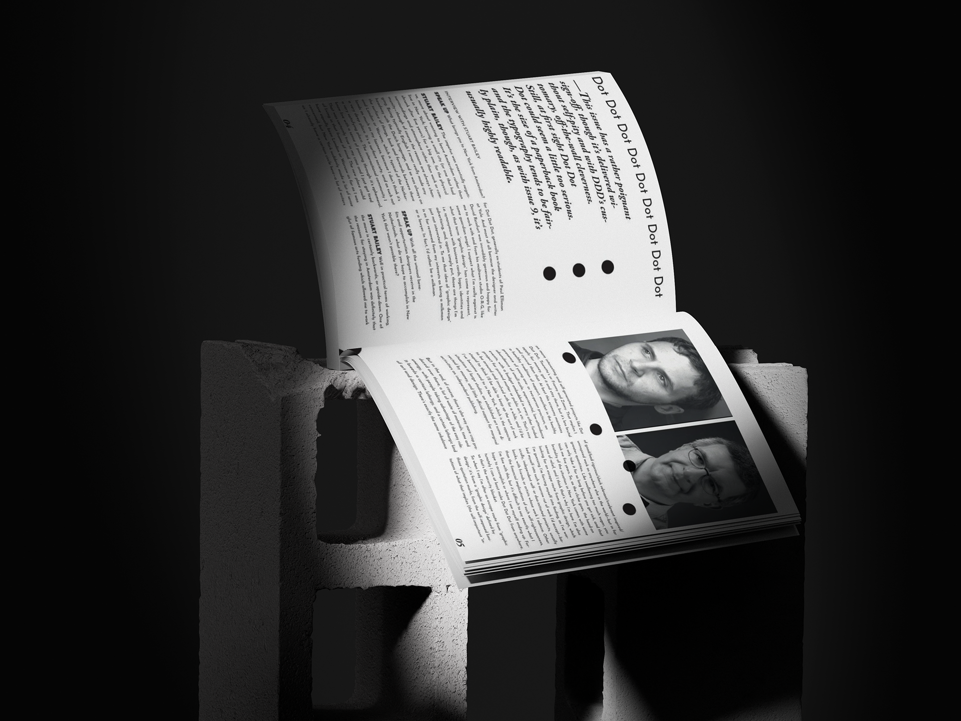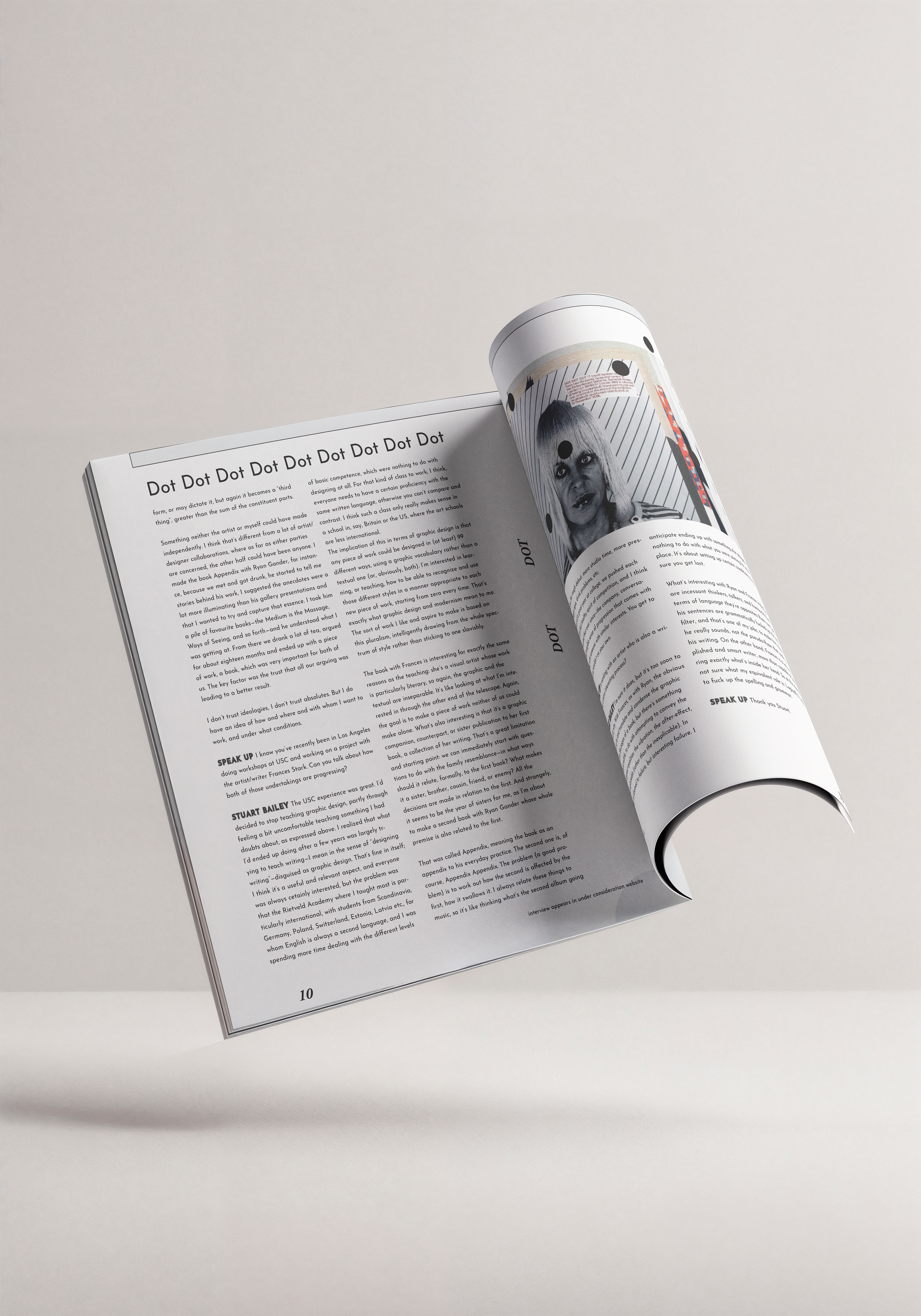 TYPOGRAPHY The repetition of the words "Dot Dot Dot" throughout the design, combined with bold, minimalist typography, serves as a visual rhythm that ties the entire publication together. This repetitive element creates a cohesive identity for the magazine, reinforcing its brand while guiding the reader's eye through the content.