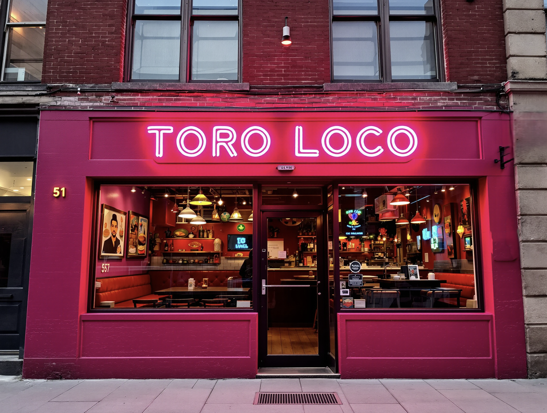 CONCEPT The redesign concept for "Toro Loco" restaurant presents a bold and energetic visual identity aimed at capturing the attention of a younger, more vibrant audience. The design leverages neon aesthetics, playful typography, and a modern color palette to create a brand that is both contemporary and deeply rooted in the lively spirit of Mexican culture.