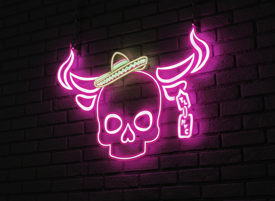 LOGO The centerpiece of the brand is the neon skull logo, adorned with a sombrero, which merges traditional Mexican iconography with a modern twist. The neon effect not only makes the logo visually striking but also evokes the nightlife culture, making it appealing to a youthful crowd who enjoy dynamic and trendy environments.