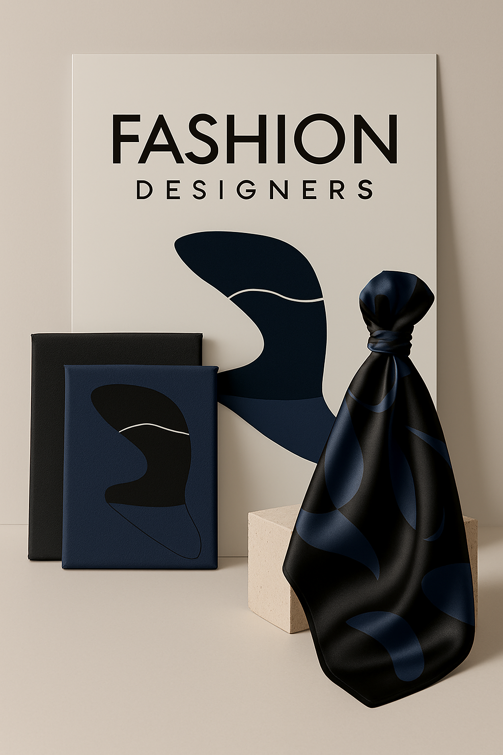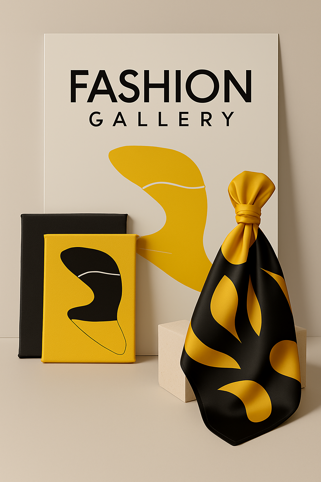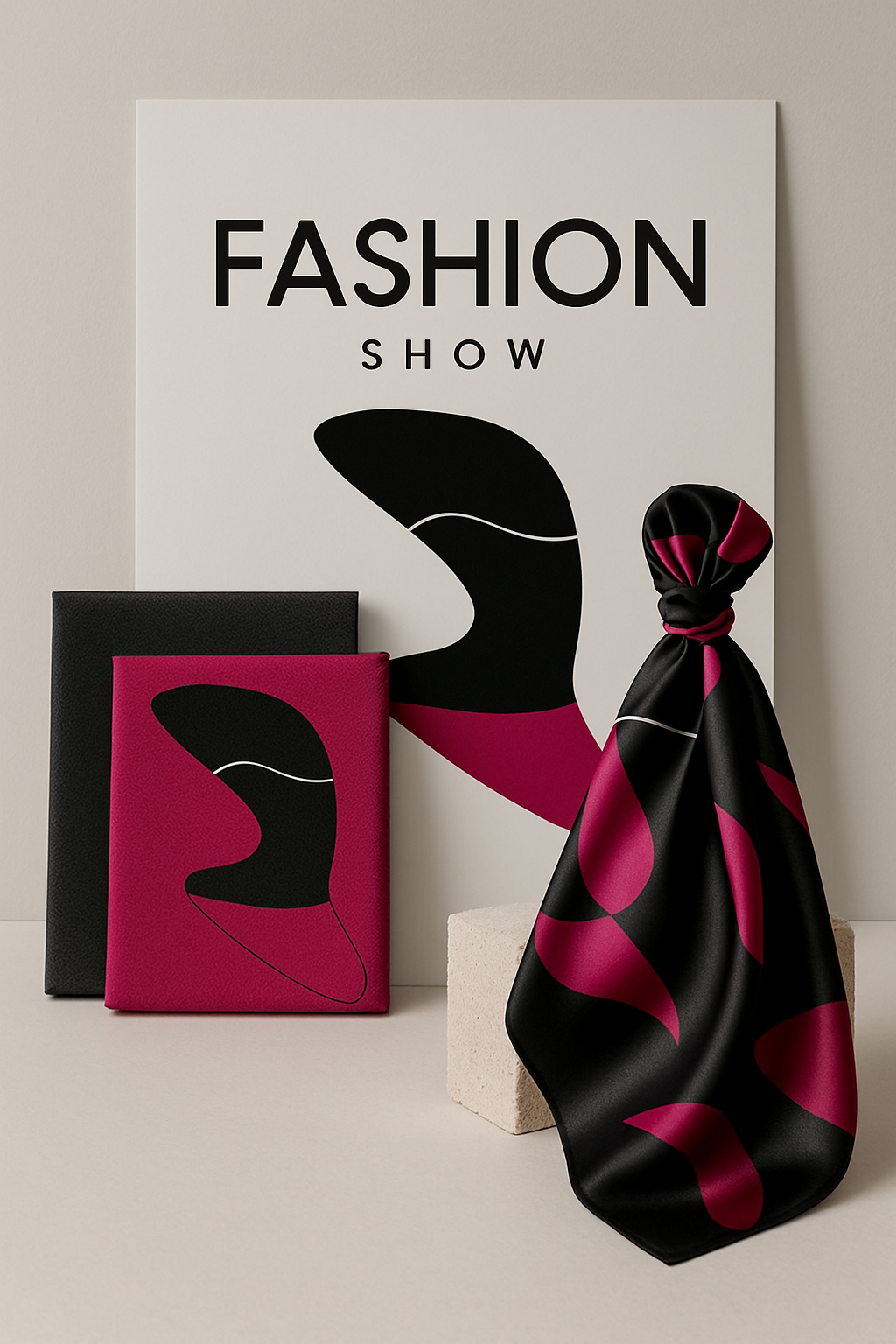 ICONIC SHAPE The large, abstract black shape in the background is reminiscent of a fashion accessory, perhaps a hat or a dramatic silhouette, subtly referencing the central theme of the event—fashion. It adds a sense of mystery and elegance, encouraging curiosity and anticipation among the viewers.